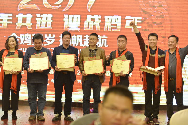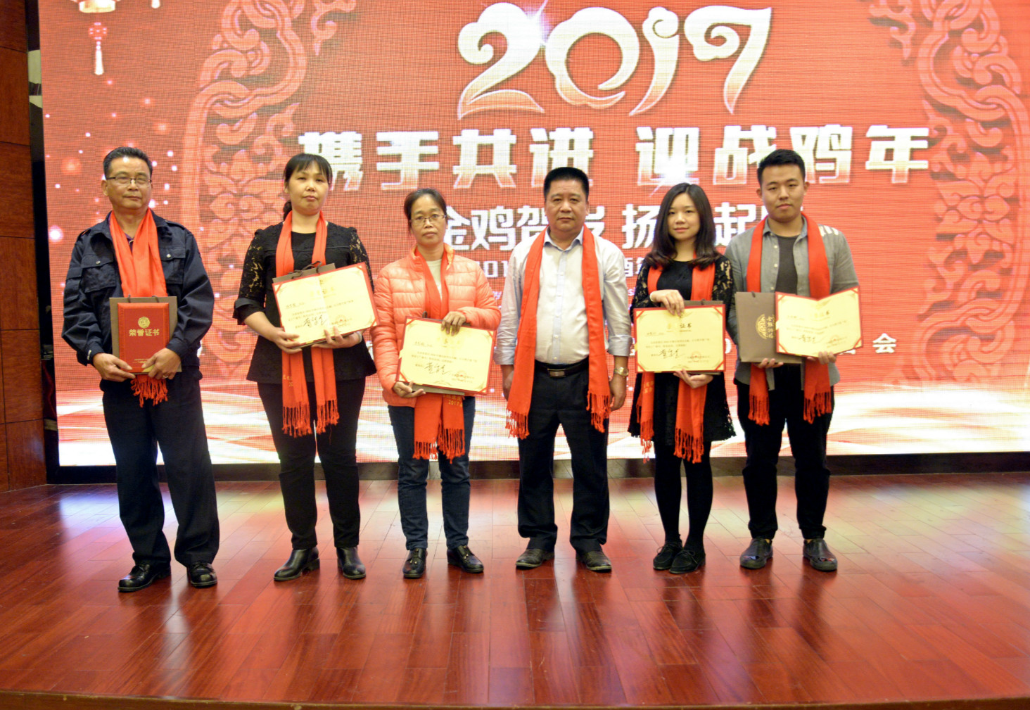 鐘穗金總經(jīng)理(左四)為優(yōu)秀員工頒獎 晚會還表演了歌曲、舞蹈、模仿秀、變臉、魔術(shù)等精彩的文藝節(jié)目;一輪又一輪的抽獎活動將晚上推向了高潮!